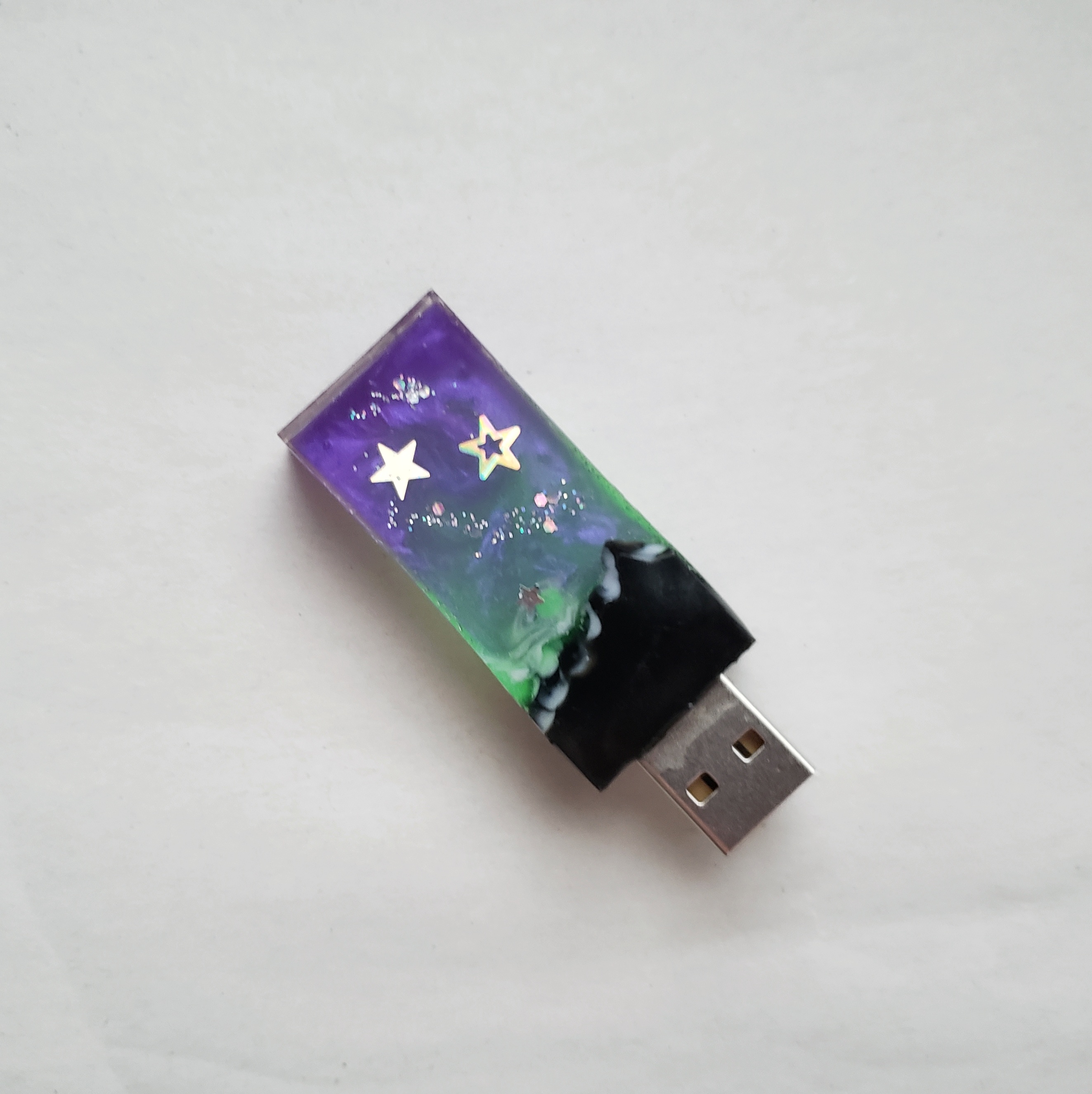I used 2 color for my USB drive. I thought the green glow in the dark powder would give a pretty, bright color, and then I used purple at the top. My goal was to have bright colors, but you’ll see later on I made them too opaque.