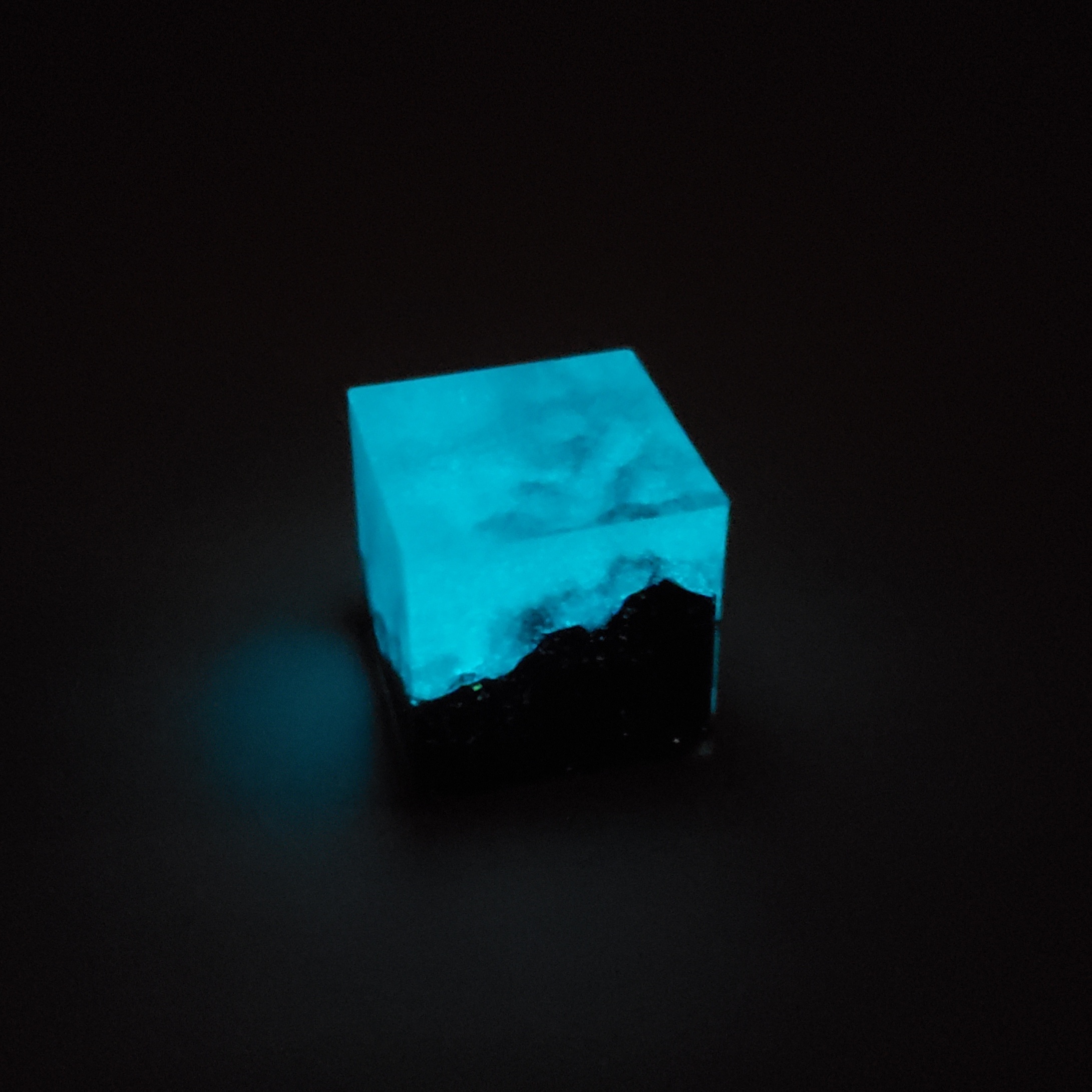 For the small cube, I used UV resin for the mountain base, and then used leftover epoxy resin from my big cube to fill it up. Before pouring it, I added some of the blue glow-in-the-dark powder.