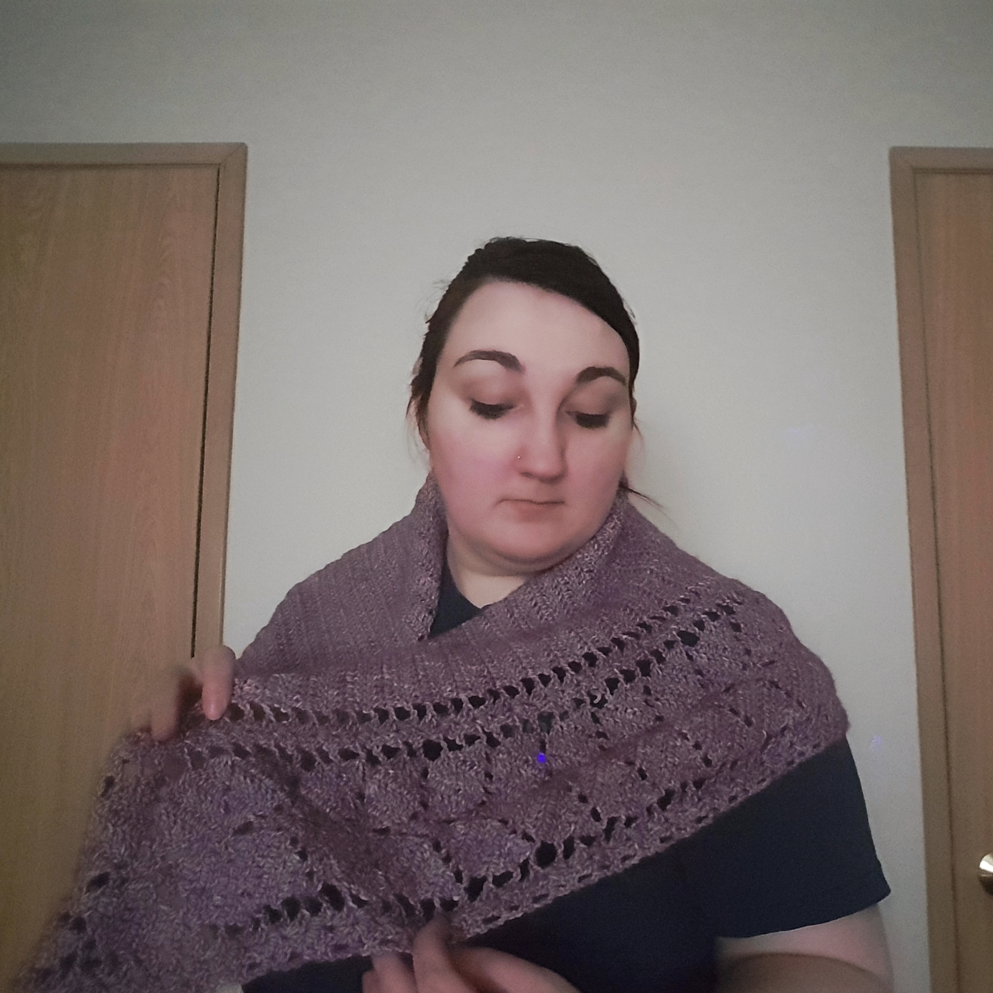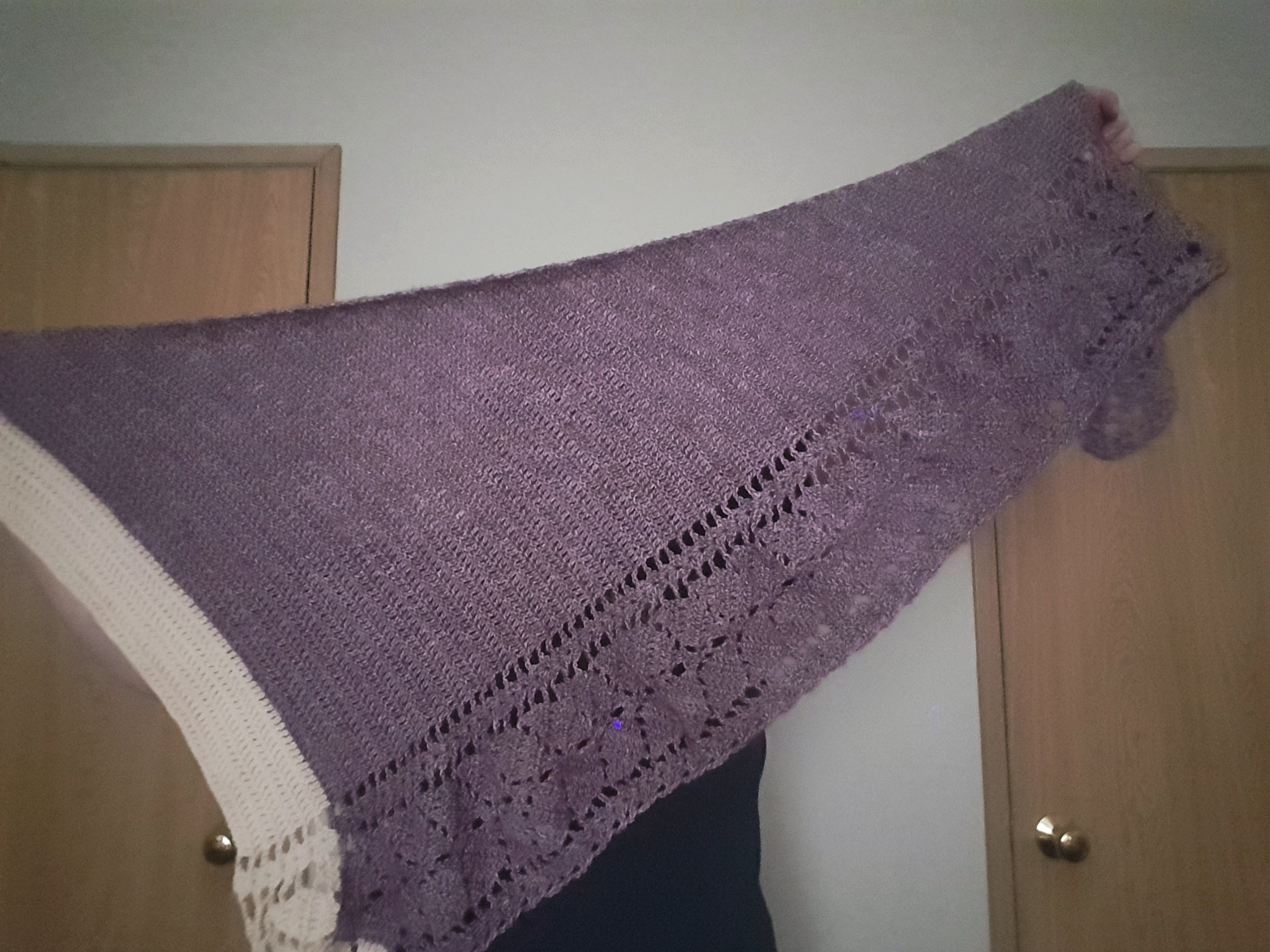 I definitely welcomed another opportunity to use the Scheepjes stonewashed yarn, and this purple was very pretty. The finished shawl feels really nice, and the leaf motif is subtle but lovely. This would be really pretty in a green or fall colors too!