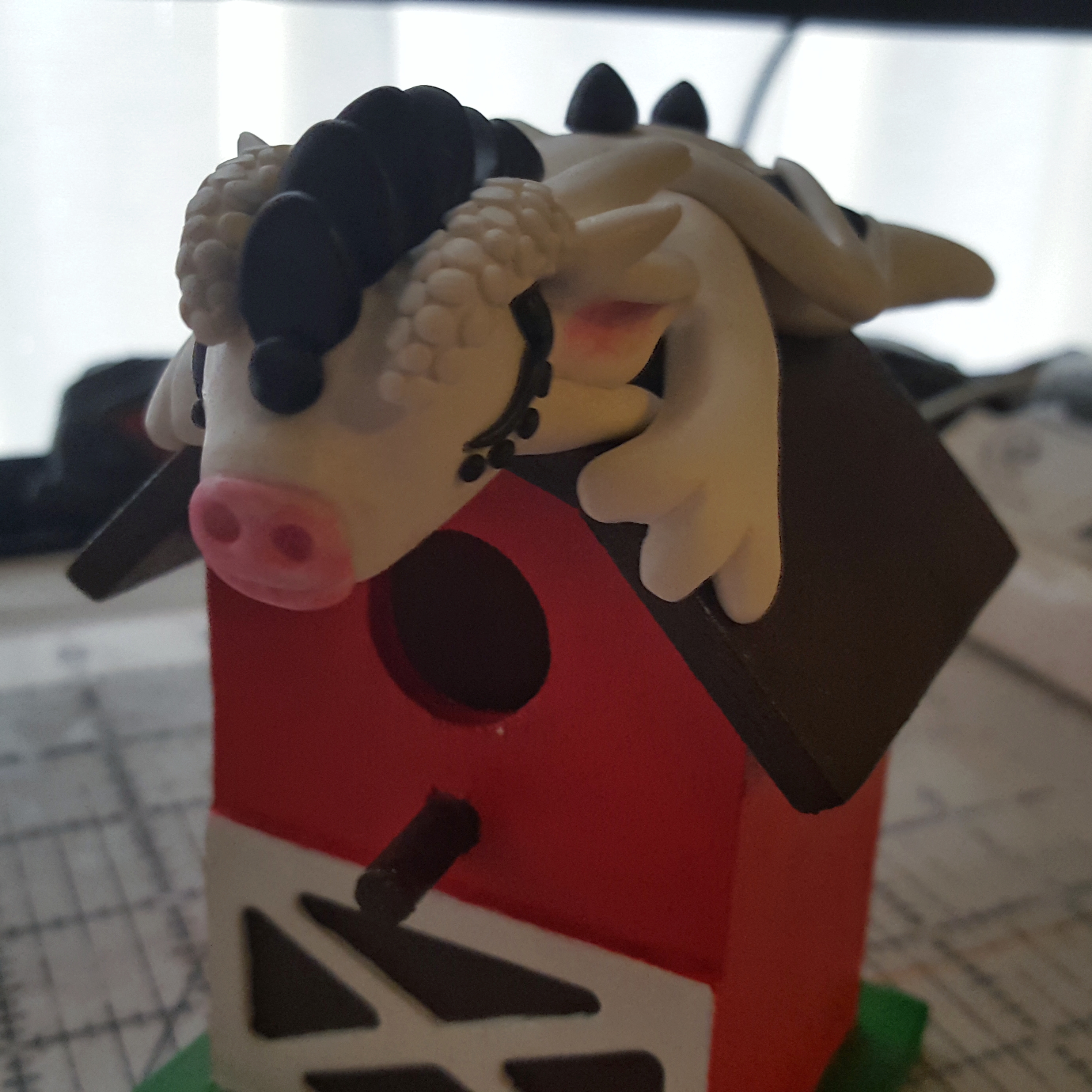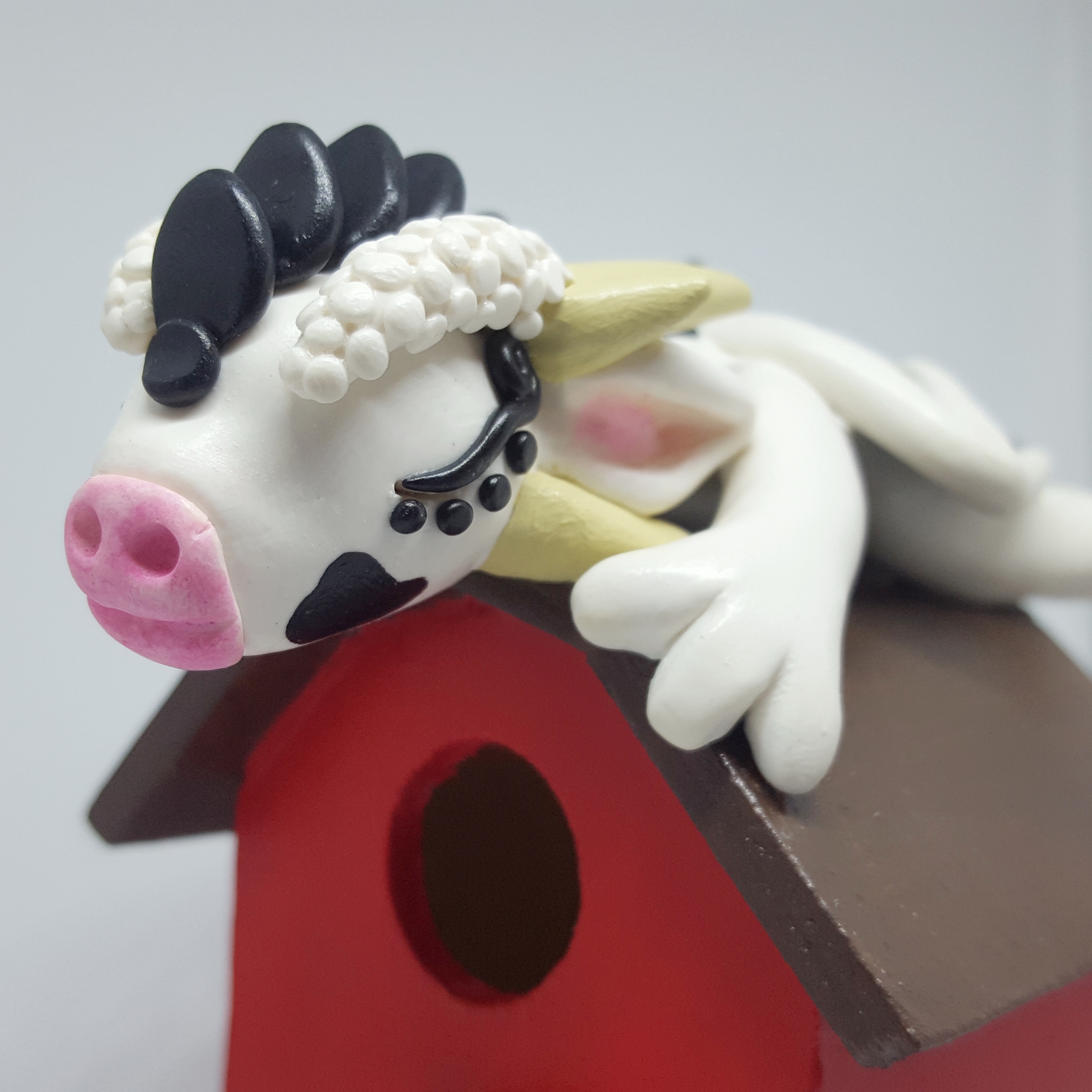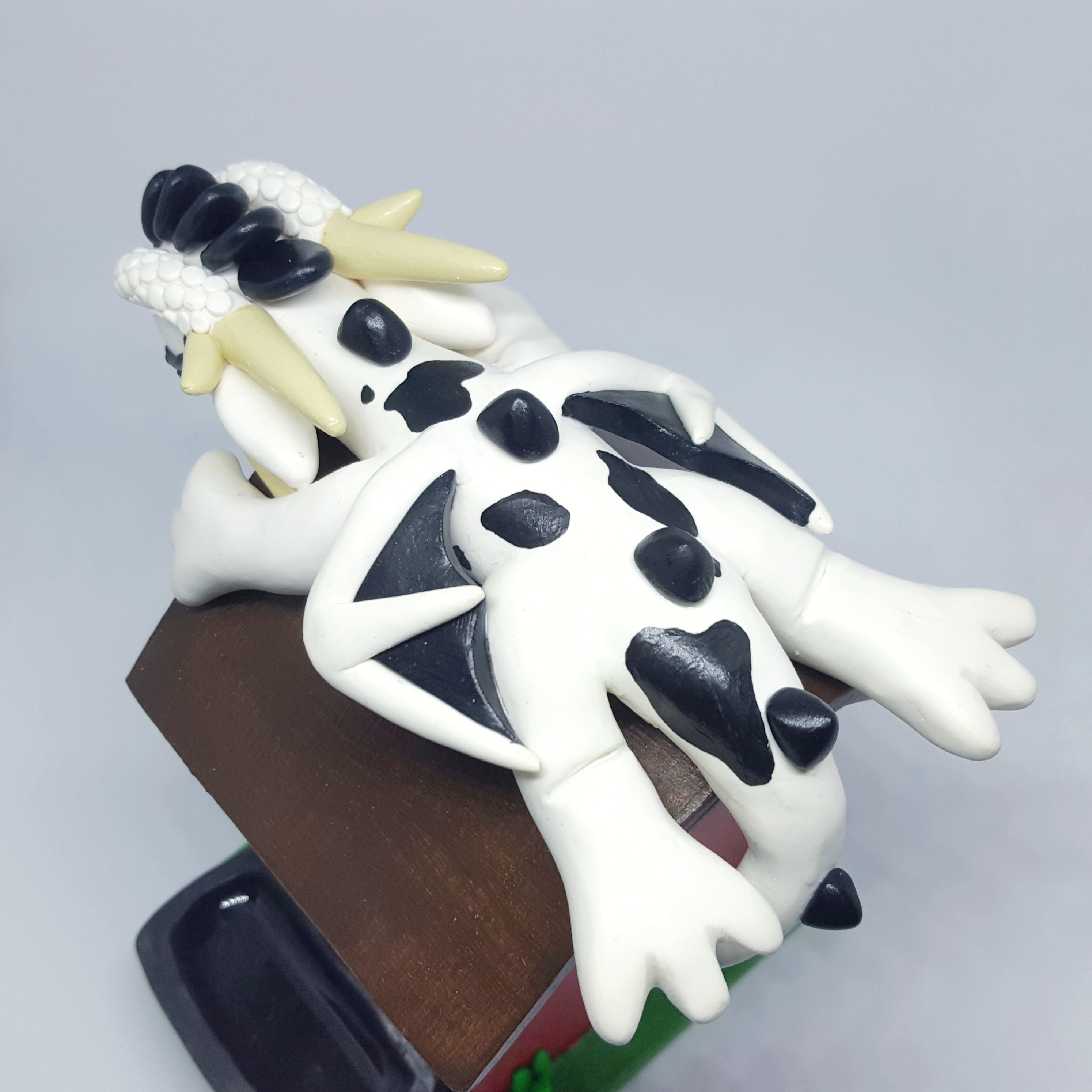 He’s so that he is sleeping on the roof, his head, back legs, and tail hanging off slightly, and the front feet wrapped around the edge of the roof. He is sculpted in white and black clay, and accented with pink chalk pastels. The spots were painted on after the dragon was baked up.