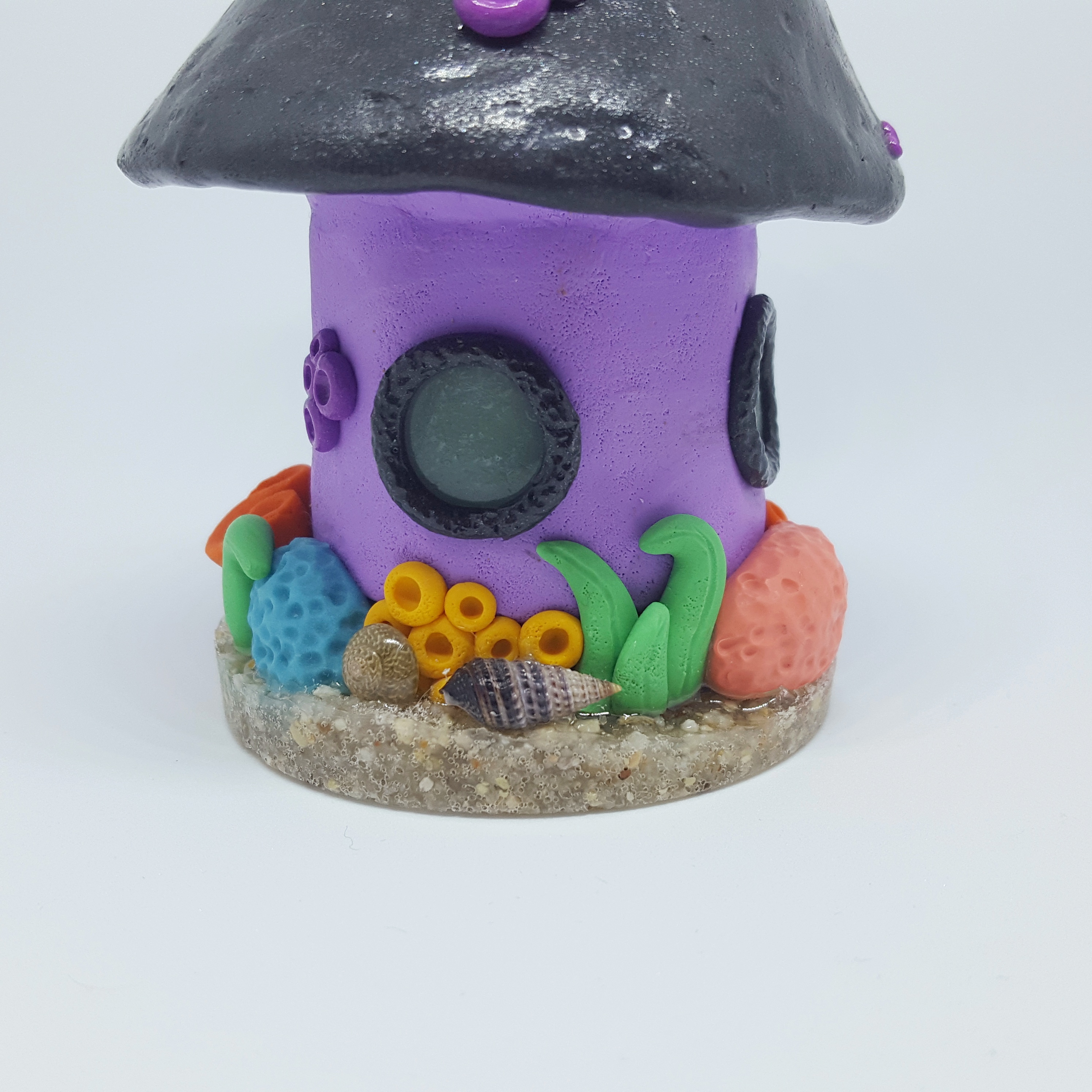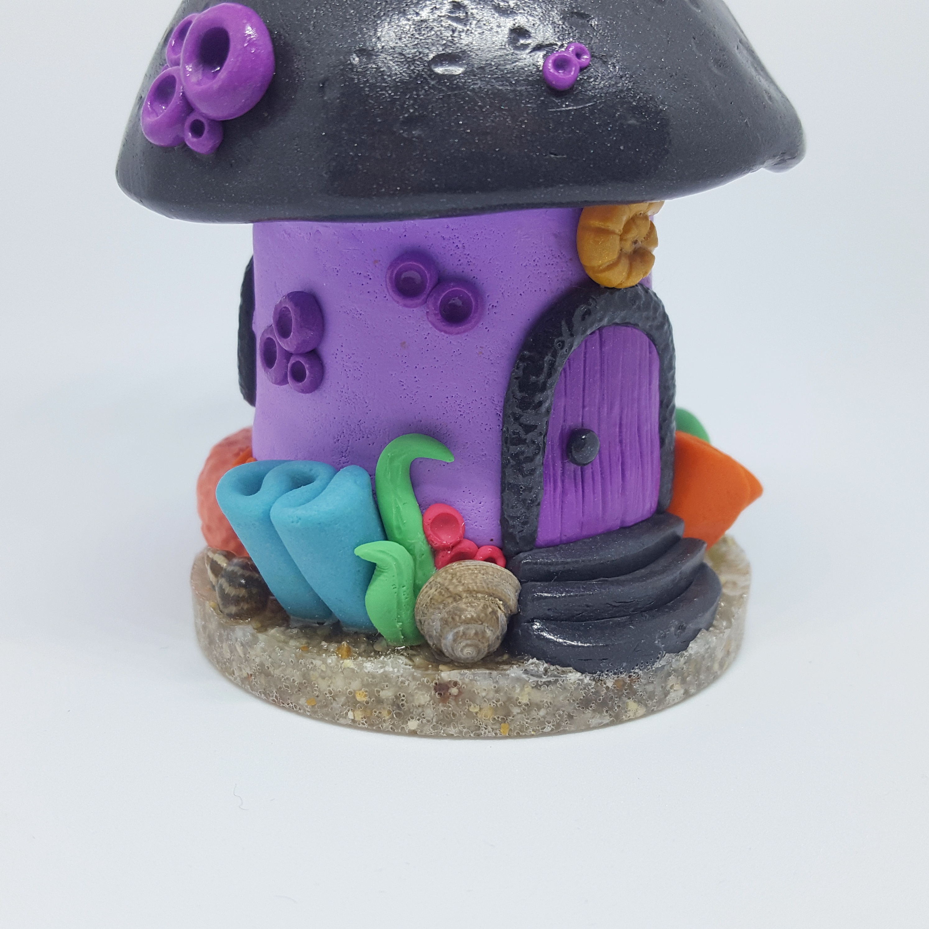 For my part of the shop swap, I was given Ursula as the villain to work with. After consulting with my recipient, @curio_obscurio, we decided to embark on creating an Ursula-inspired fairy house. I incorporated parts of Ursula’s color palette, underwater accents, and cutesified the whole thing because that’s what I do! I tried to emulate an erroded rock for the roof, something smooth with a little texture from the current running over it constantly.