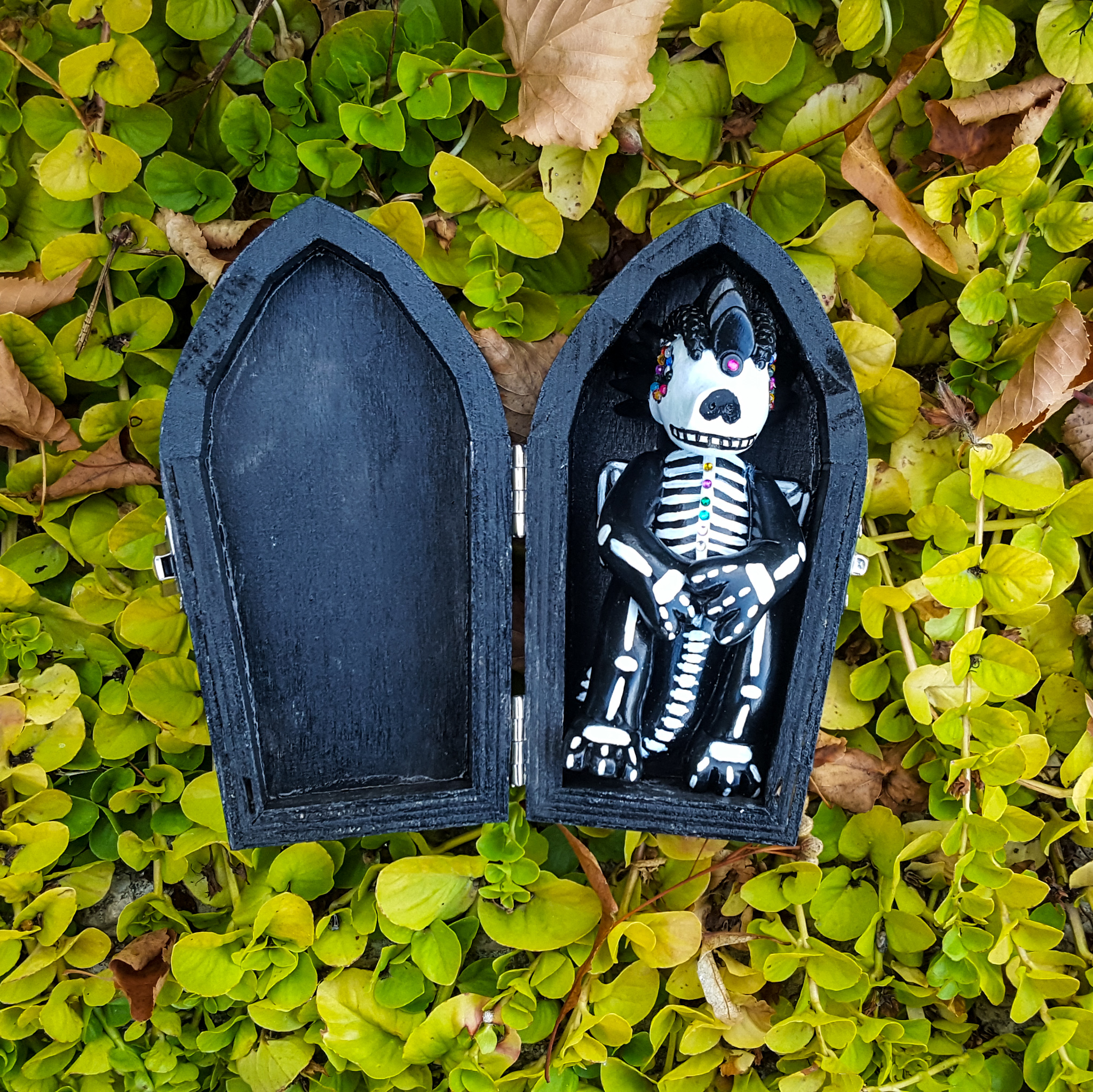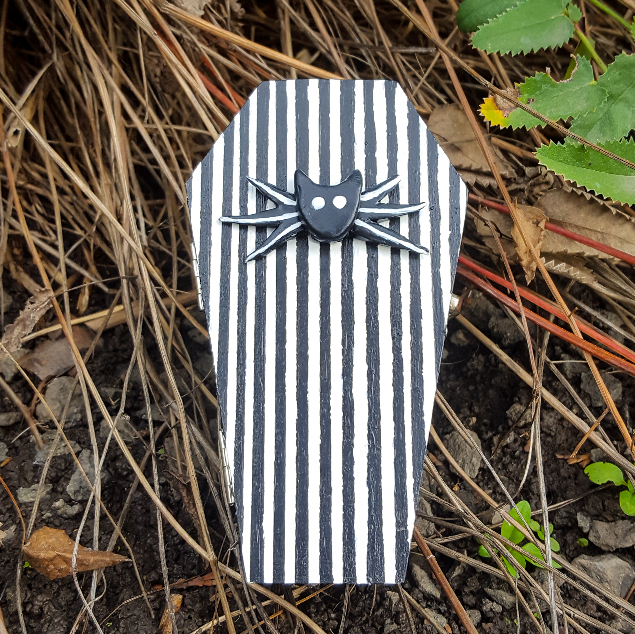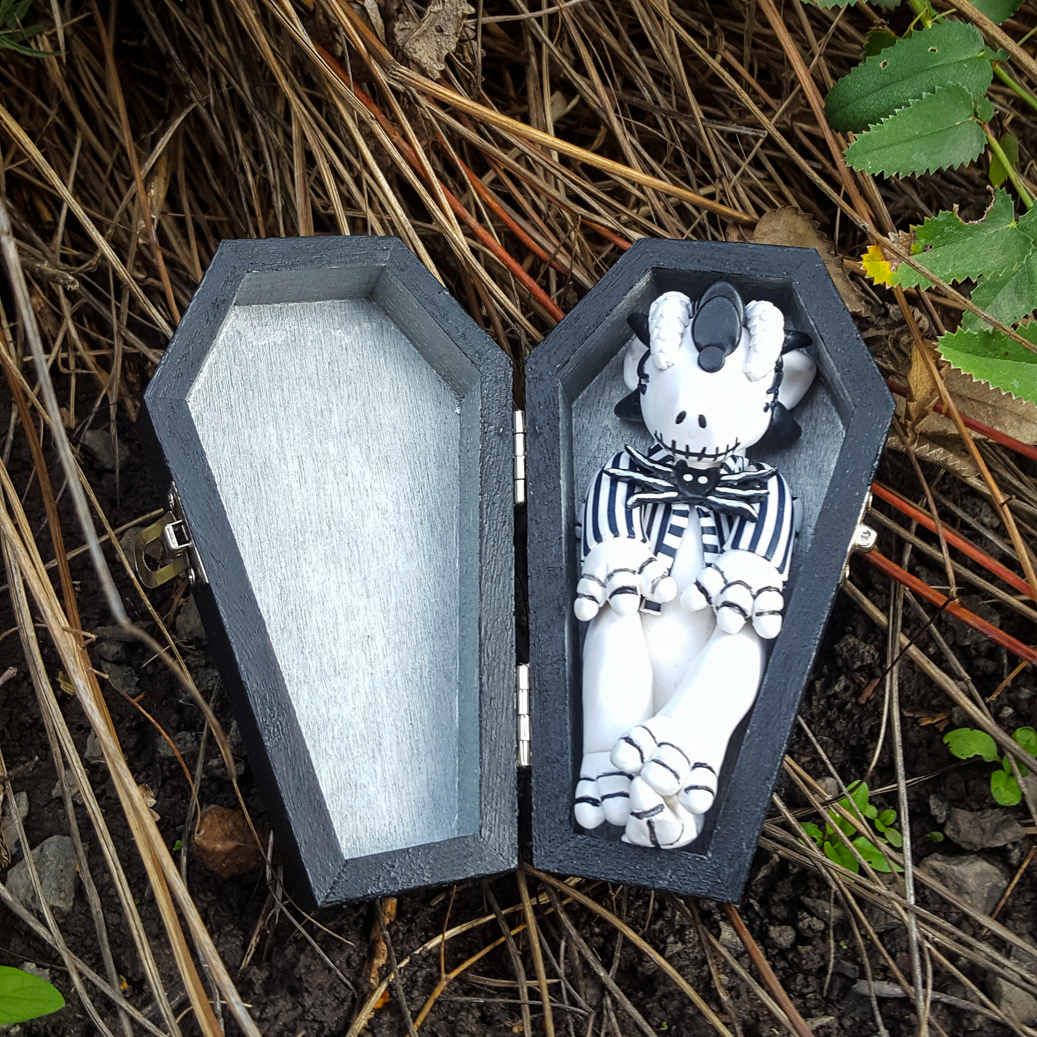 His coffin has a striped front to match his little jacket. I decided to paint the rest of the outside black to contrast against Jack, and the inside is silver for the same reason. This gave me a third color that complimented the color scheme without straying away from the black and white too much.
