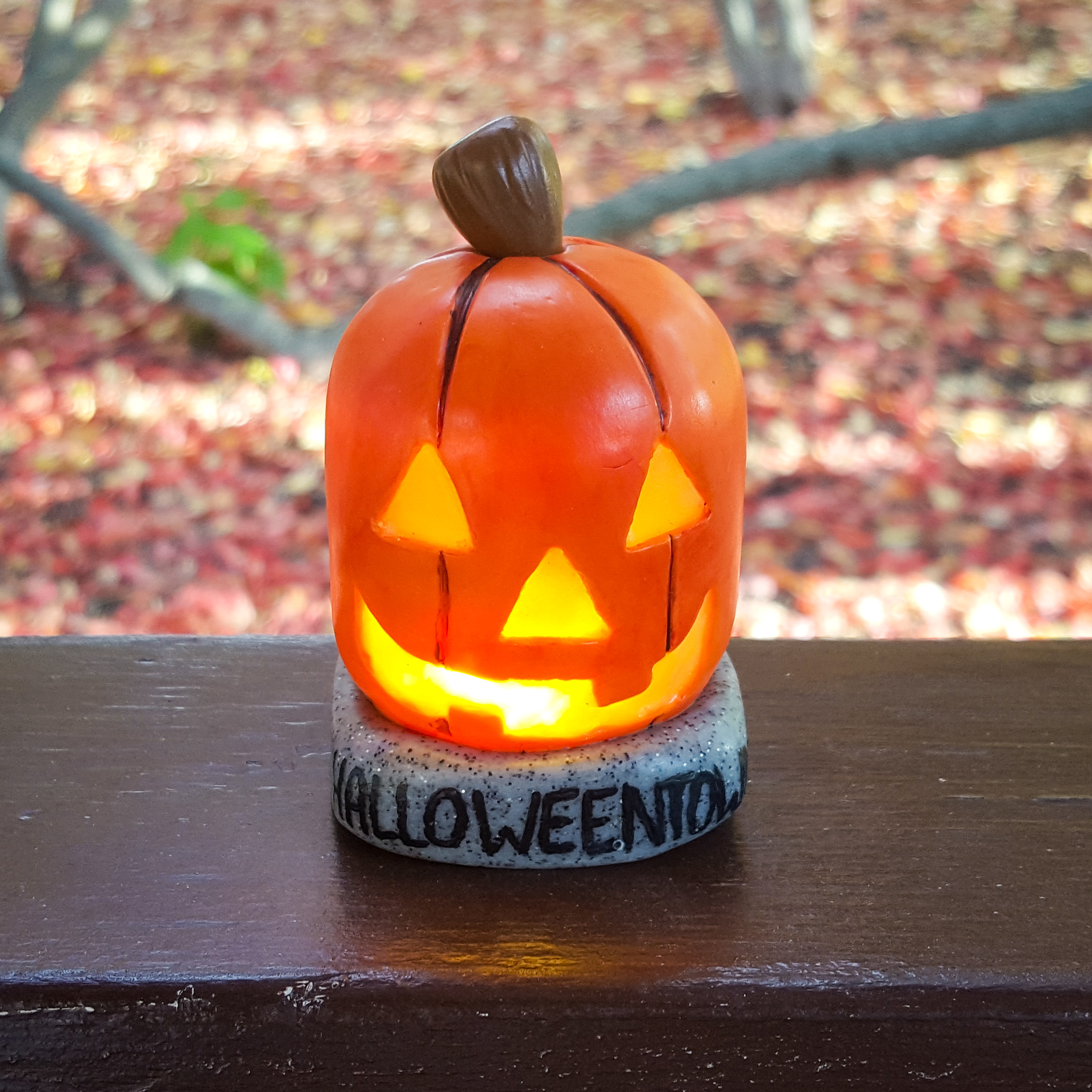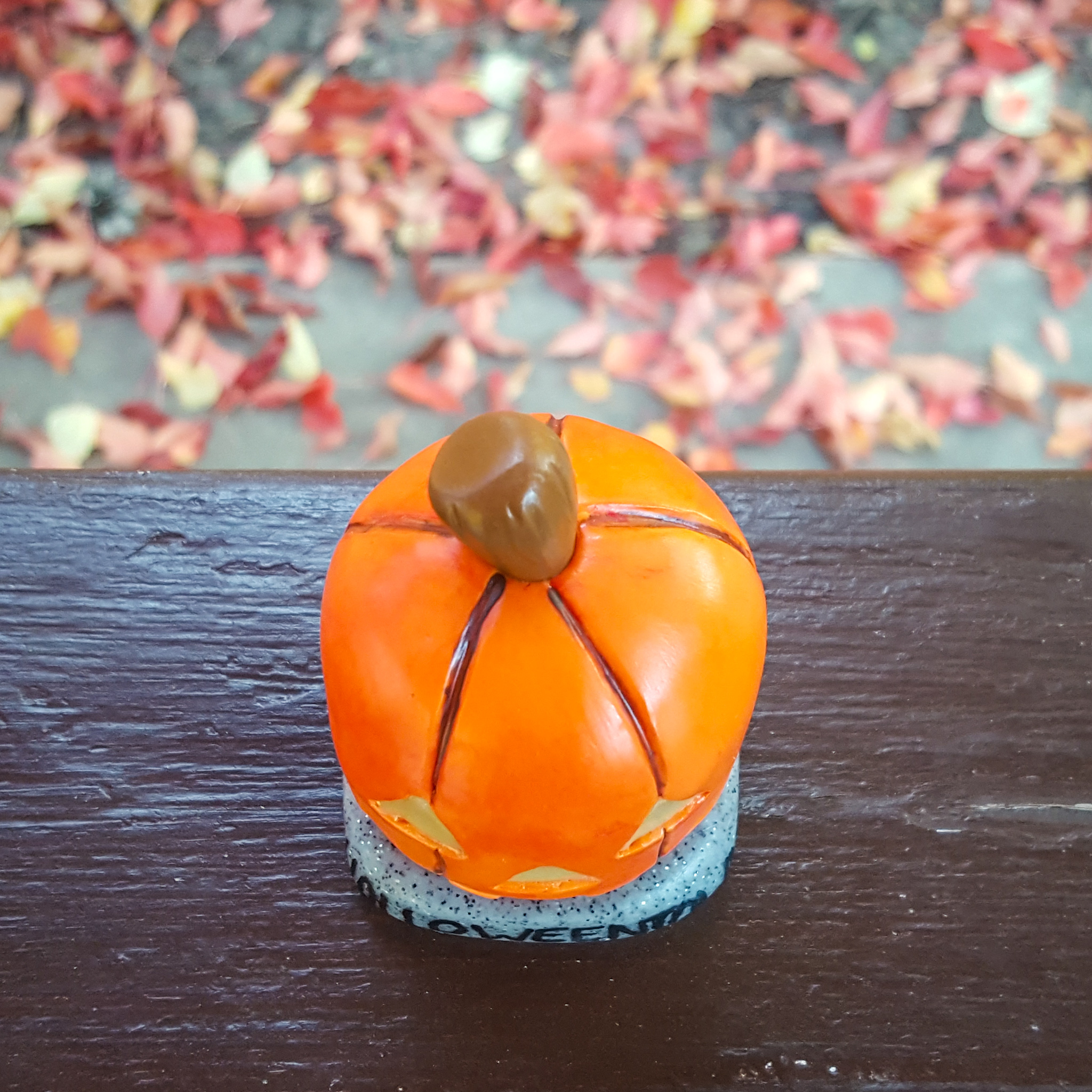 The stone base of the pumpkin was much more simplified in my figurine, so I didn’t concern myself with carving out the intricate details of the pedestal, but I did use granite clay to give it a more stone-like appearance, and I painted the word “Halloweentown” (again, this isn’t the only wording on the pedestal in the movie, but I wanted to bring in the basics to mimic the original) in black acrylic paint before sealing everything off.