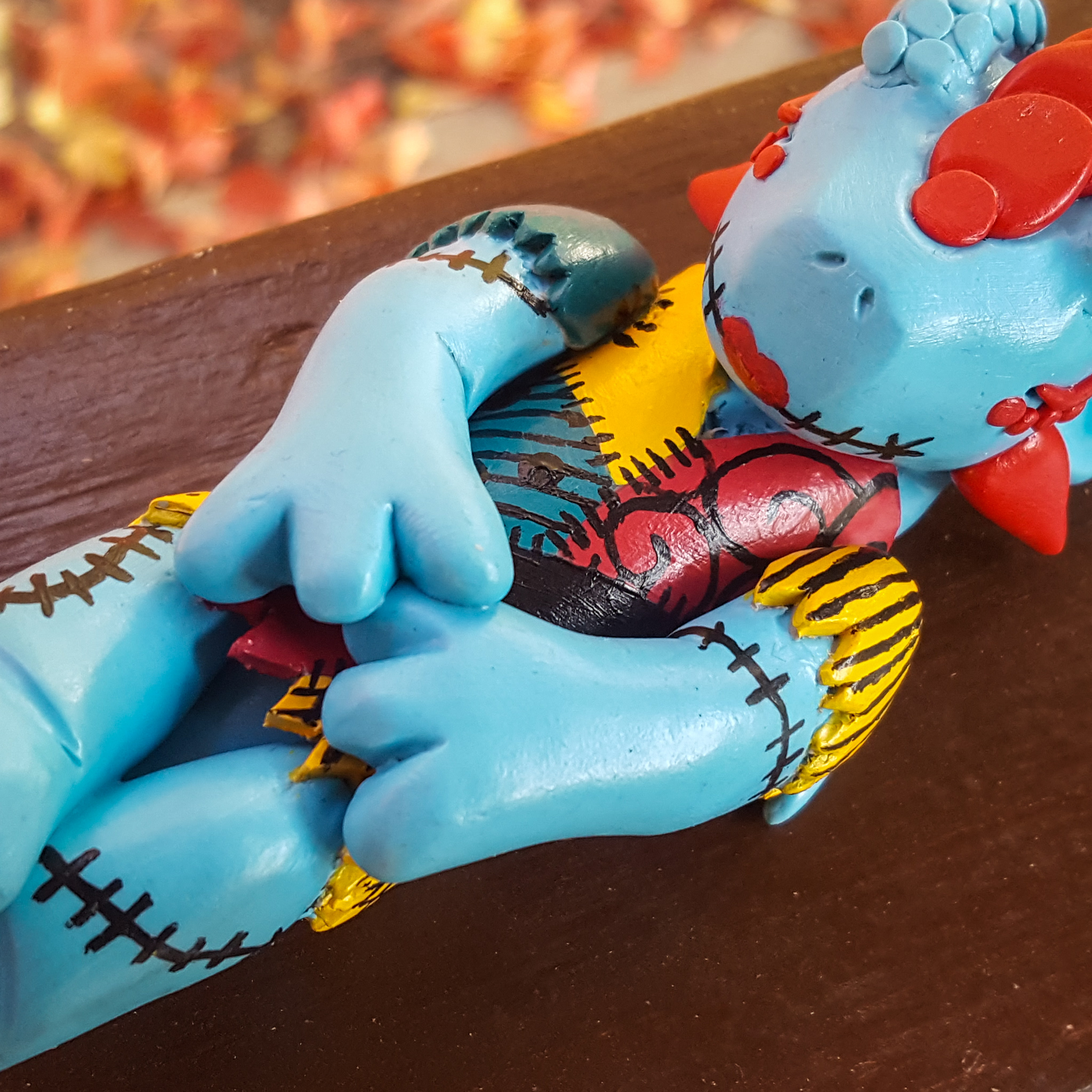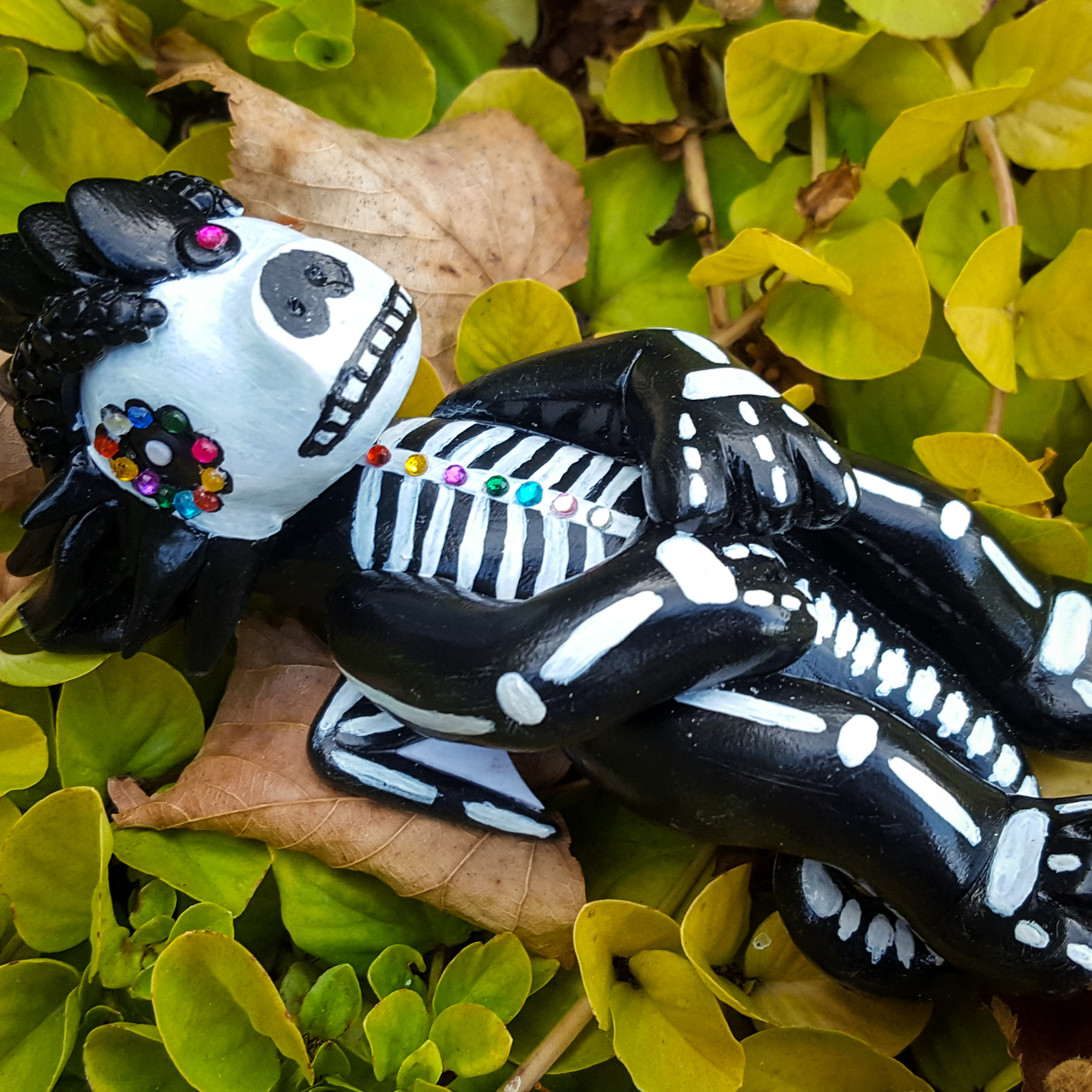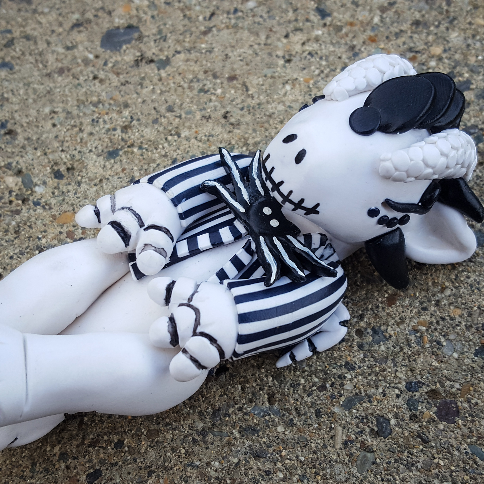 For Jack, the colors were fairly straightforward, and I had some of my stripe cane leftover from the first time I made Jack. His body is white, with black accents, and I sculpted some skeletal details in his fingers, toes, wings, and tail. These lines were filled in with black paint to give them more dimension.