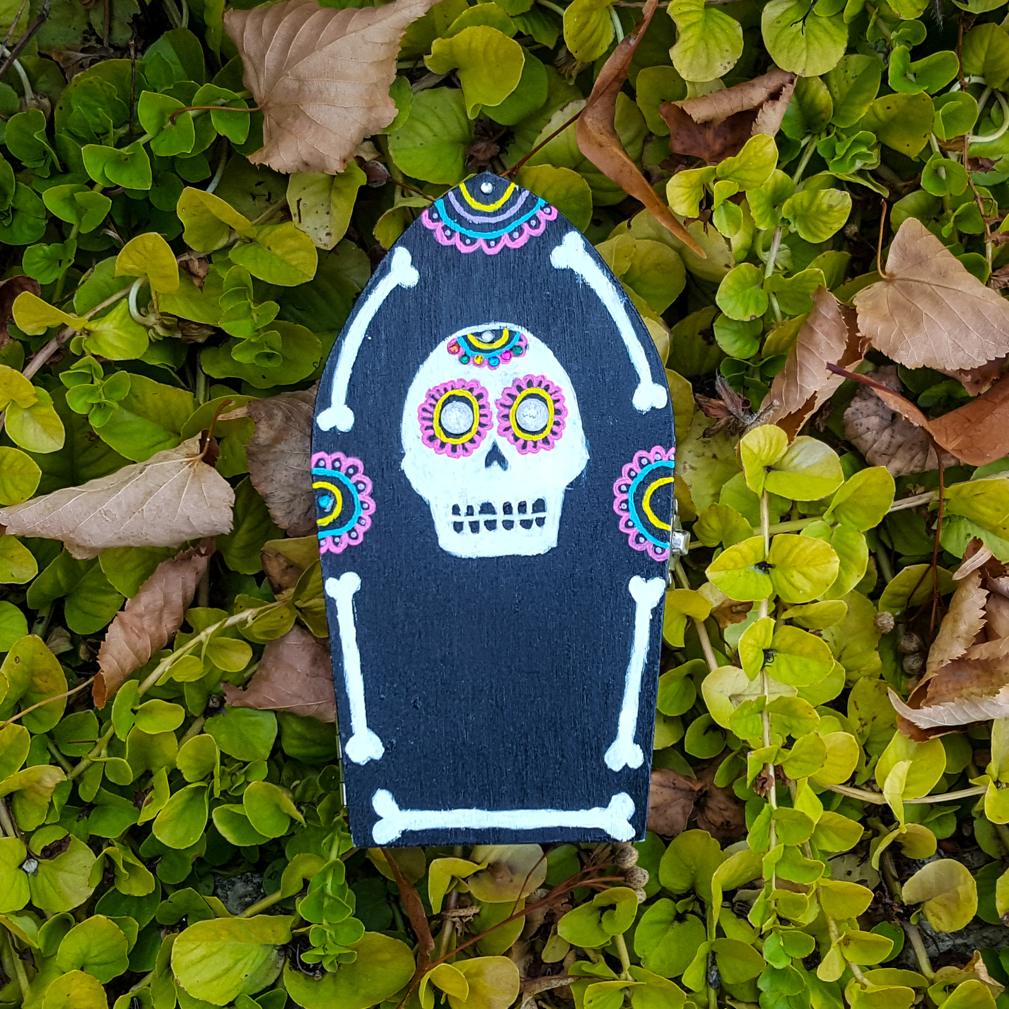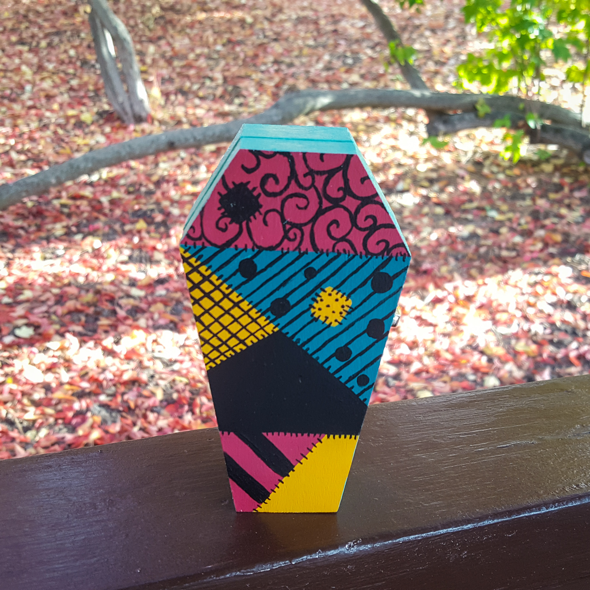 The front of her coffin has a series of geometric shapes painted in the pattern of her dress. This followed her dress as far as fabric patterns are concerned, but I changed up the layout and patches. The rest of the outside is a bright light blue (a tad more pastel than her skin tone, but I thought it went really well with the other colors). I painted the inside in tones from her dress as well to tie everything together and make sure she would contrast well with the background. I chose the magenta and golden yellow for these areas, as I felt the black would make everything else seem dull, and I didn’t want the teal to blend into her body color.
