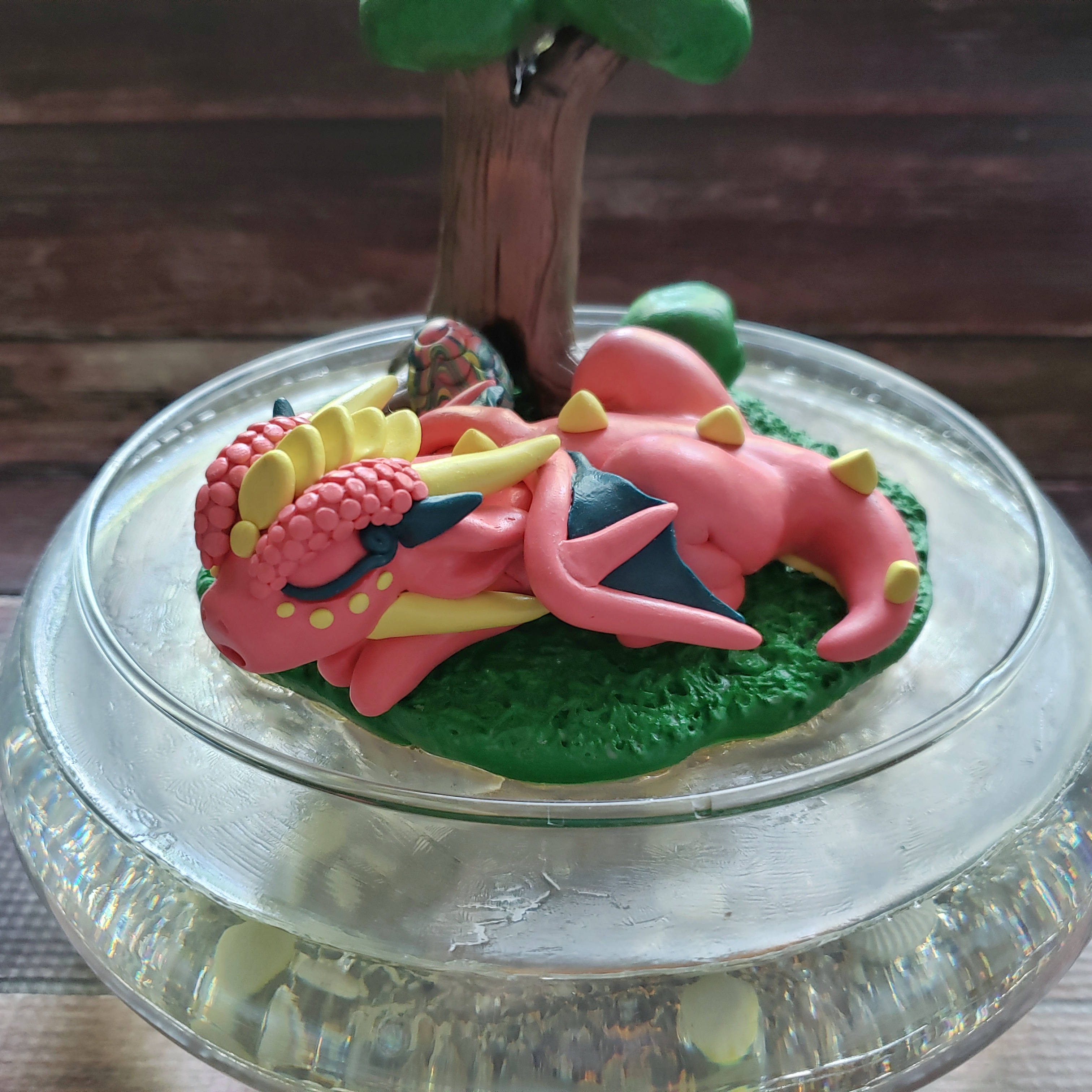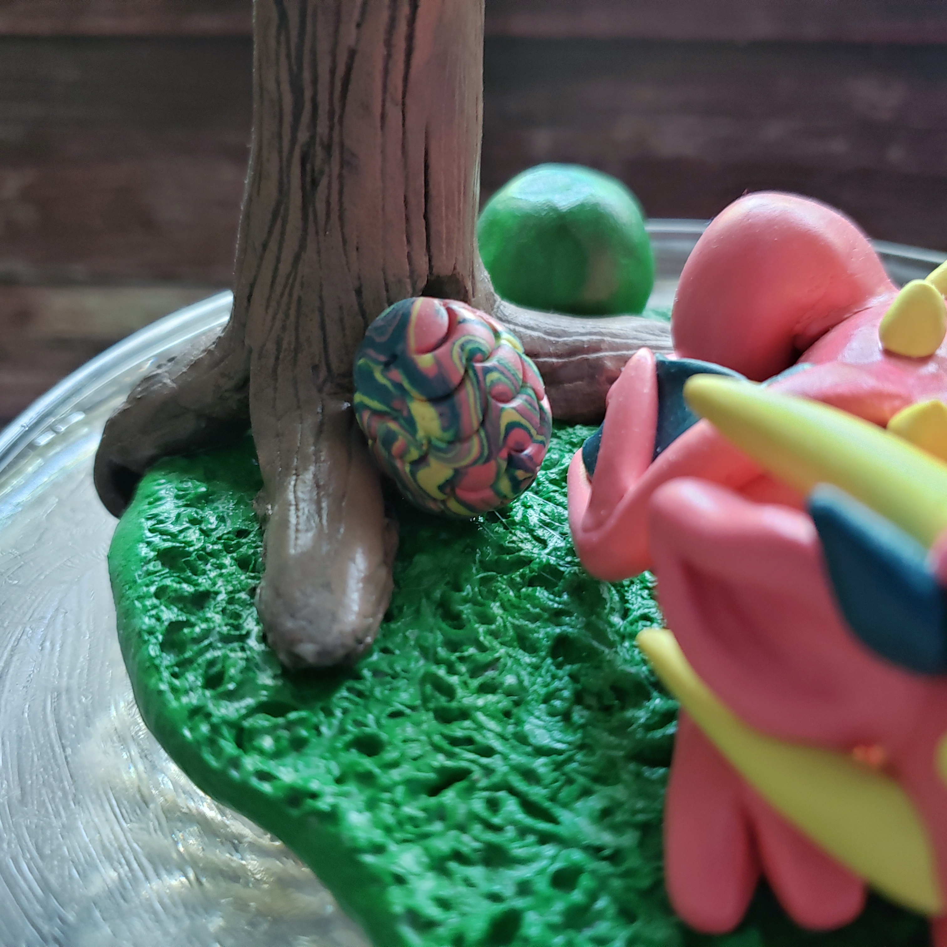 I thought it would be nice to play off of time passing and generations, so I made a marbled dragon egg to complete the scene. There’s the ancestral dragon skeleton underneath, a present day dragon sleeping, and a dragon waiting to see what the future holds for it.