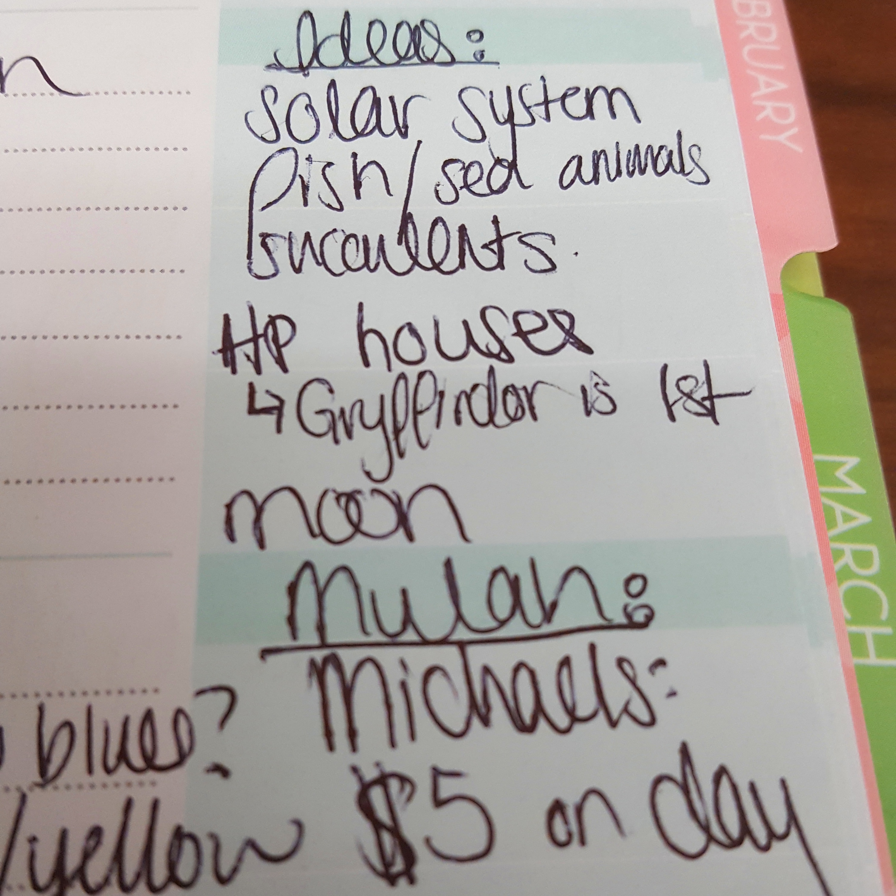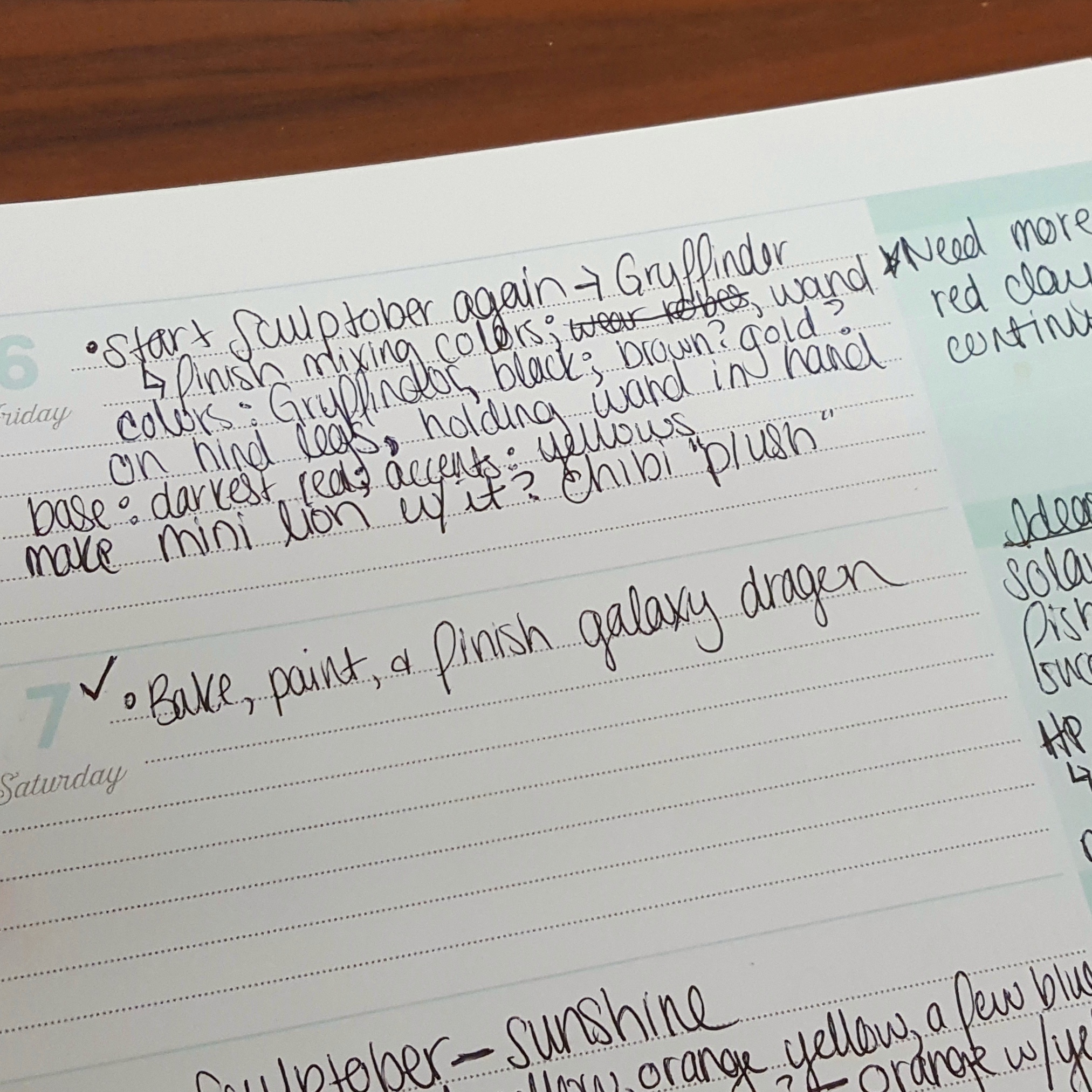 1) I can tentatively schedule out time, and I can write down the specifics for each on the first day I start the project. For example, the day I planned to start on my Gryffindor dragon, I wrote down the colors I would use, any accessories, and the pose the dragon would be in. Later on I added a note in the margin about running out of red clay. These are usually placed on the weekends because that’s when I have the most time to sculpt.