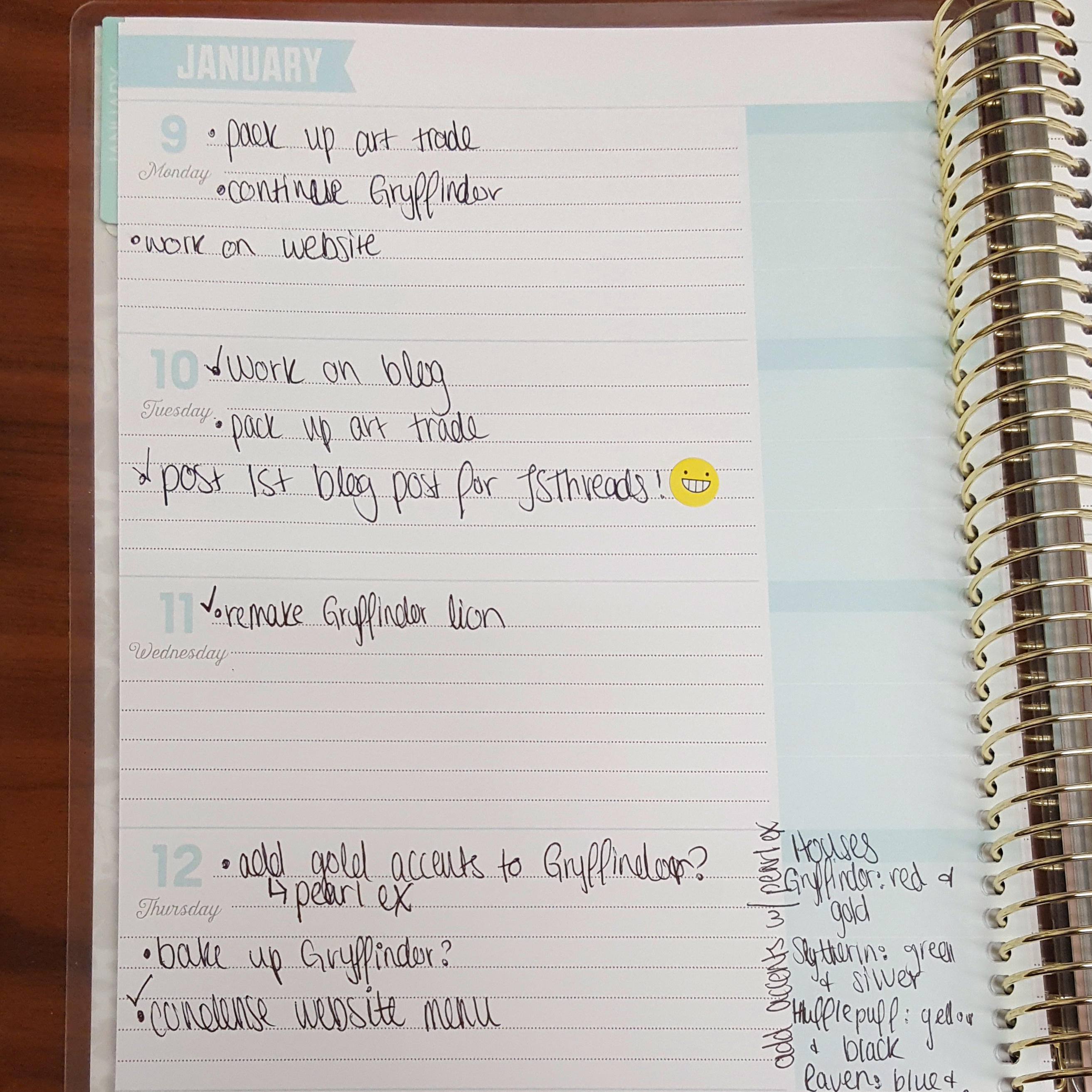 My last goal revolves around a planner. Even through college, I found myself using a planner to organize homework, activities, and other events. Once I graduated, I didn’t really need one anymore. I resorted to “to do” lists to help me keep on top of what needed to get done professionally, personally, and with JSThreads. This year, I’ve come up with a few different ways I can utilize a planner for my polymer clay/crochet work: