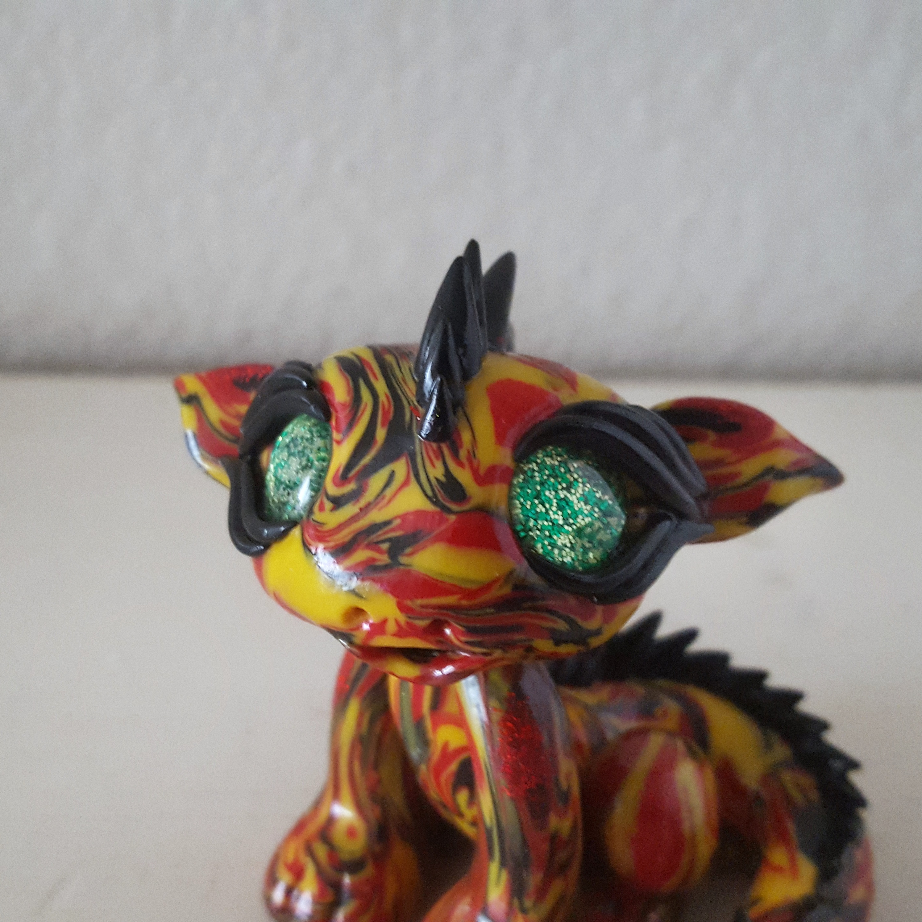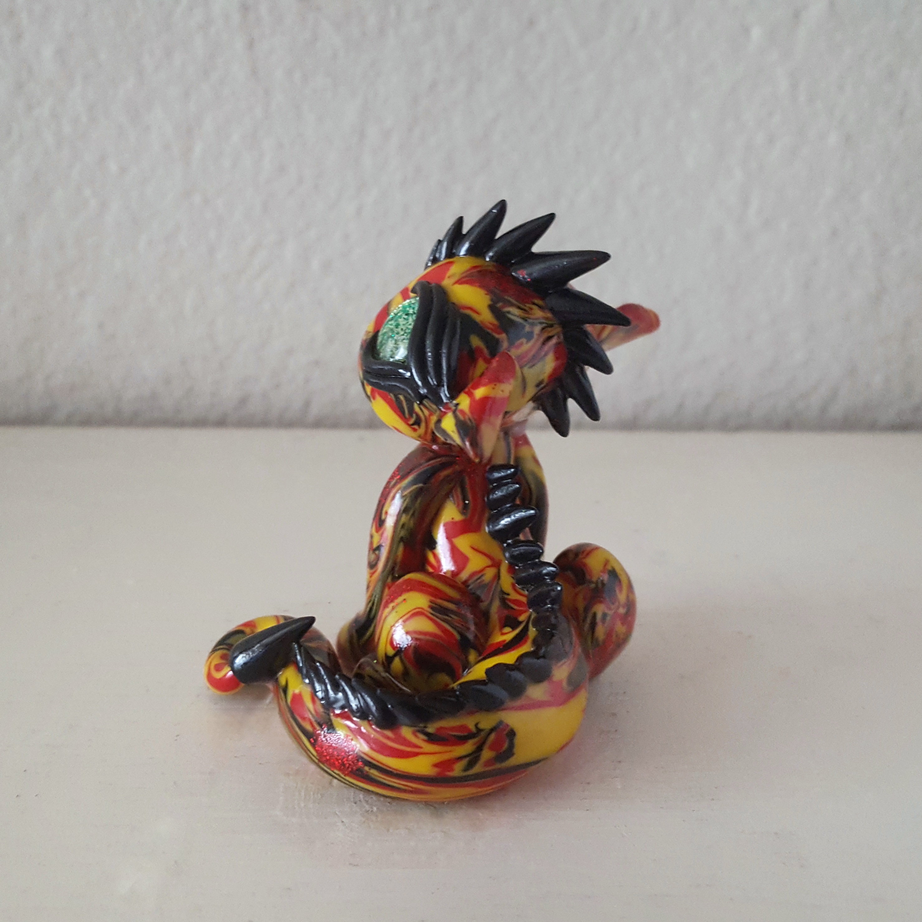 The dragons from MySunKissed studio are full of bright colors and interesting marbled textures of polymer clay, and after looking through her feed, I thought it’d be fun to order a dragon that had marbling in the colors of the German flag (I’m half German, and I thought the bold colors would work really well together). Look at how adorable it is!