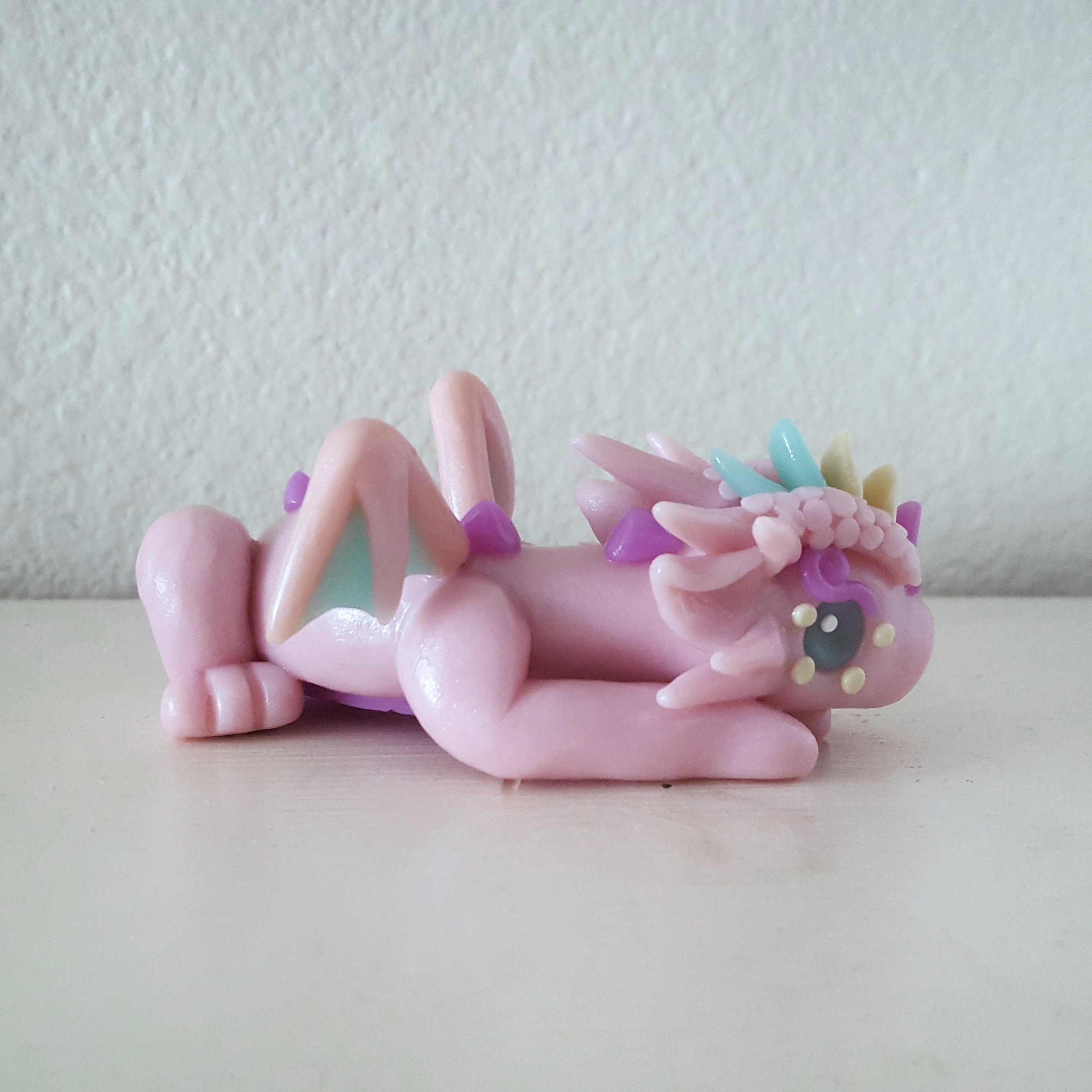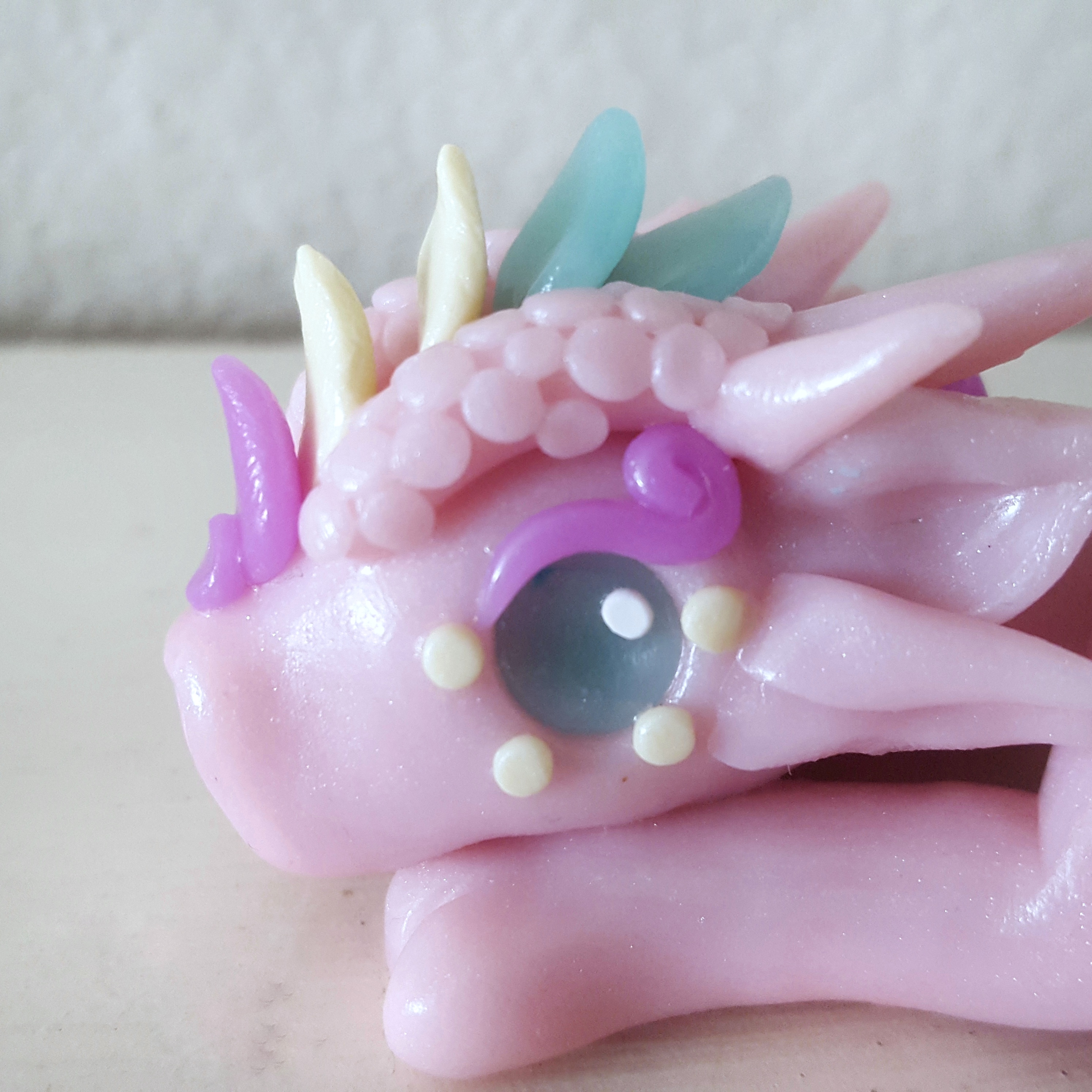 As for the dragon I made for Shannon, she wanted a custom dragon that was pastel and translucent, so I did not hesitate to pick up my ice and rose quartz clay for some more gemstone clay fun. I also mixed up a translucent purple and a very slightly transparent, but very pastel, yellow. The pink was the main color while the blue and purple played as my two main accents.